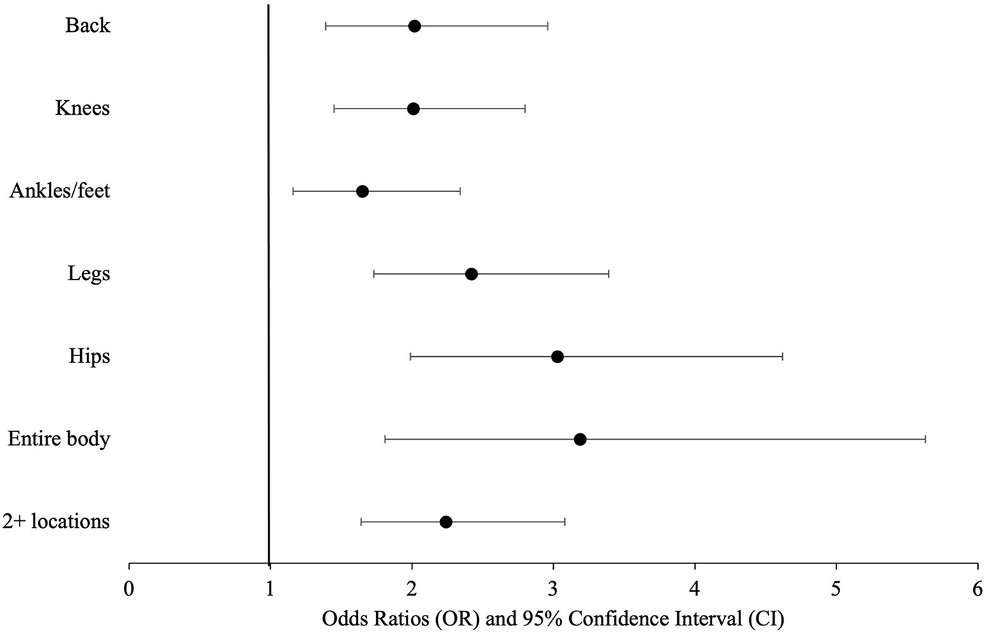 At baseline (n = 841), 77.3% of participants had multimorbidity. Those with multimorbidity had greater odds [2.27, 95% confidence interval (CI): 1.74, 2.95] of reporting pain on weight-bearing over time, compared to those without multimorbidity. Also, those with multimorbidity had 2.12 times the odds of reporting pain that limited their daily activities (95% CI: 1.61, 2.78) compared to those without multimorbidity. Lastly, those with multimorbidity had higher odds of reporting pain in their back, knee, ankles/feet, legs, hips, entire body, or two or more locations, compared to those without multimorbidity.
