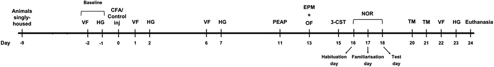 Schematic of the study outlining the timeline of behavioral tests. 3-CST: three-chamber sociability test, CFA, complete Freund's adjuvant; EPM, elevated plus maze; HG, Hargreaves’ test; inj, injection; NOR, novel object recognition test; OF, open field; PEAP, place escape/avoidance paradigm; TM, T-maze test; VF, von Frey test.