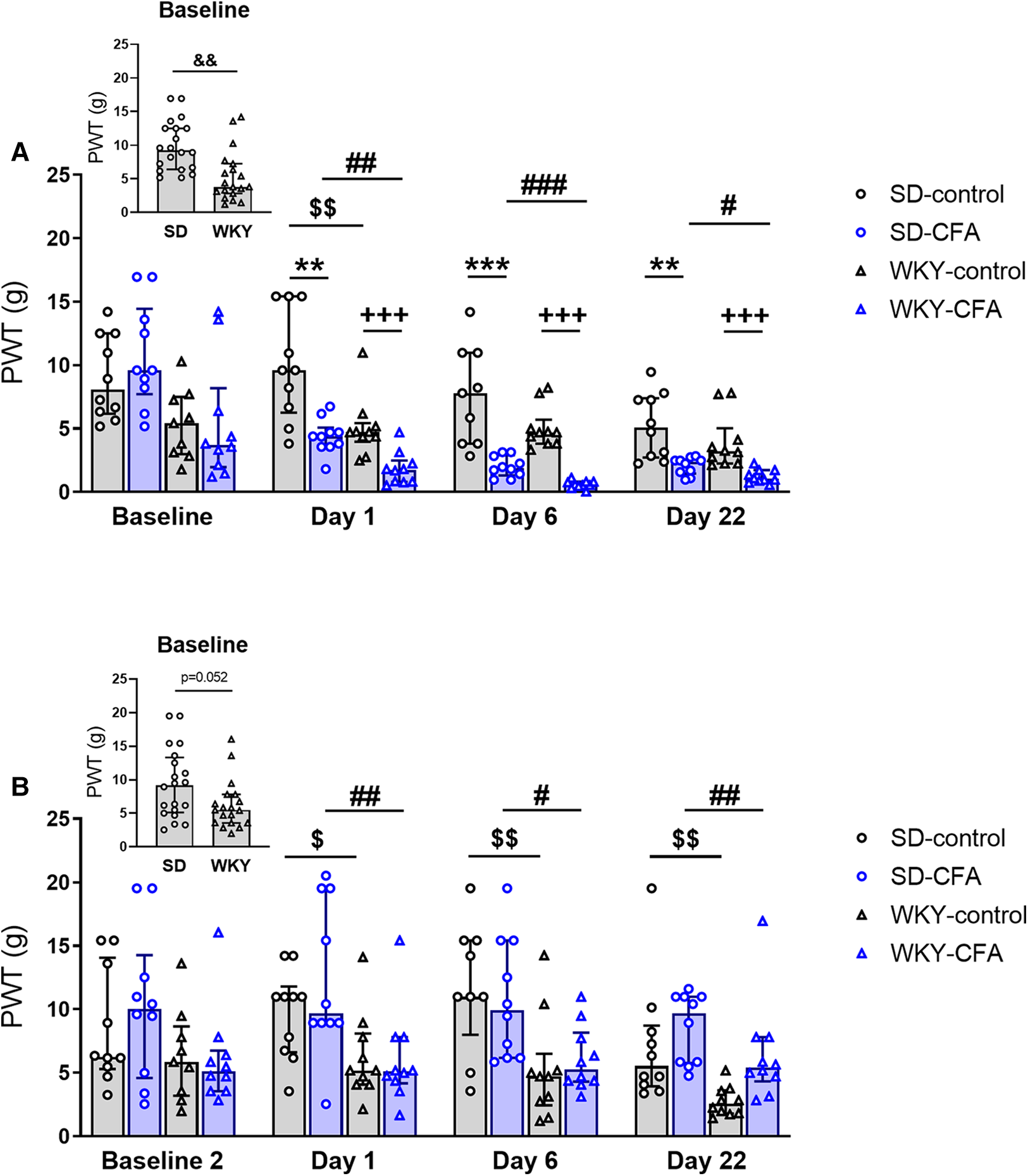 Time course of the effects of CFA injection on nociceptive responding to mechanical stimuli on the (A) ipsilateral and (B) contralateral hind paws in SD and WKY rats. (A) Ipsilateral side: CFA injection produced mechanical hypersensitivity in both rat strains, assessed using VF test [**p < 0.01, ***p < 0.001 (SD-CFA vs. SD-control), +++p < 0.001 (WKY-CFA vs. WKY-control)]. CFA-induced mechanical hypersensitivity was greater in WKY rats than SD rats on Days 1, 6, and 22 post-injection [#p < 0.05, ##p < 0.01, ###p < 0.001 (WKY-CFA vs. SD-CFA)]. WKY rats also displayed lower PWT than SD rats at baseline (inset: &&p < 0.01, WKY vs. SD, n = 20/group) and on Day 1 ($$p < 0.01, WKY-control vs. SD-control) in the absence of CFA. (B) Contralateral side: WKY rats overall showed enhanced mechanical sensitivity compared to SD rats on Days 1, 6, and 22 [$p < 0.05, $$p < 0.01, $$p < 0.01 (WKY-control vs. SD-control); ##p < 0.01, #p < 0.05, ##p < 0.01 (WKY-CFA vs. SD-CFA)]. Data are expressed as median with IQR, n = 8–10/group. CFA, complete Freund's adjuvant; PWT, paw withdrawal threshold; SD, Sprague–Dawley; VF, von Frey; WKY, Wistar–Kyoto.