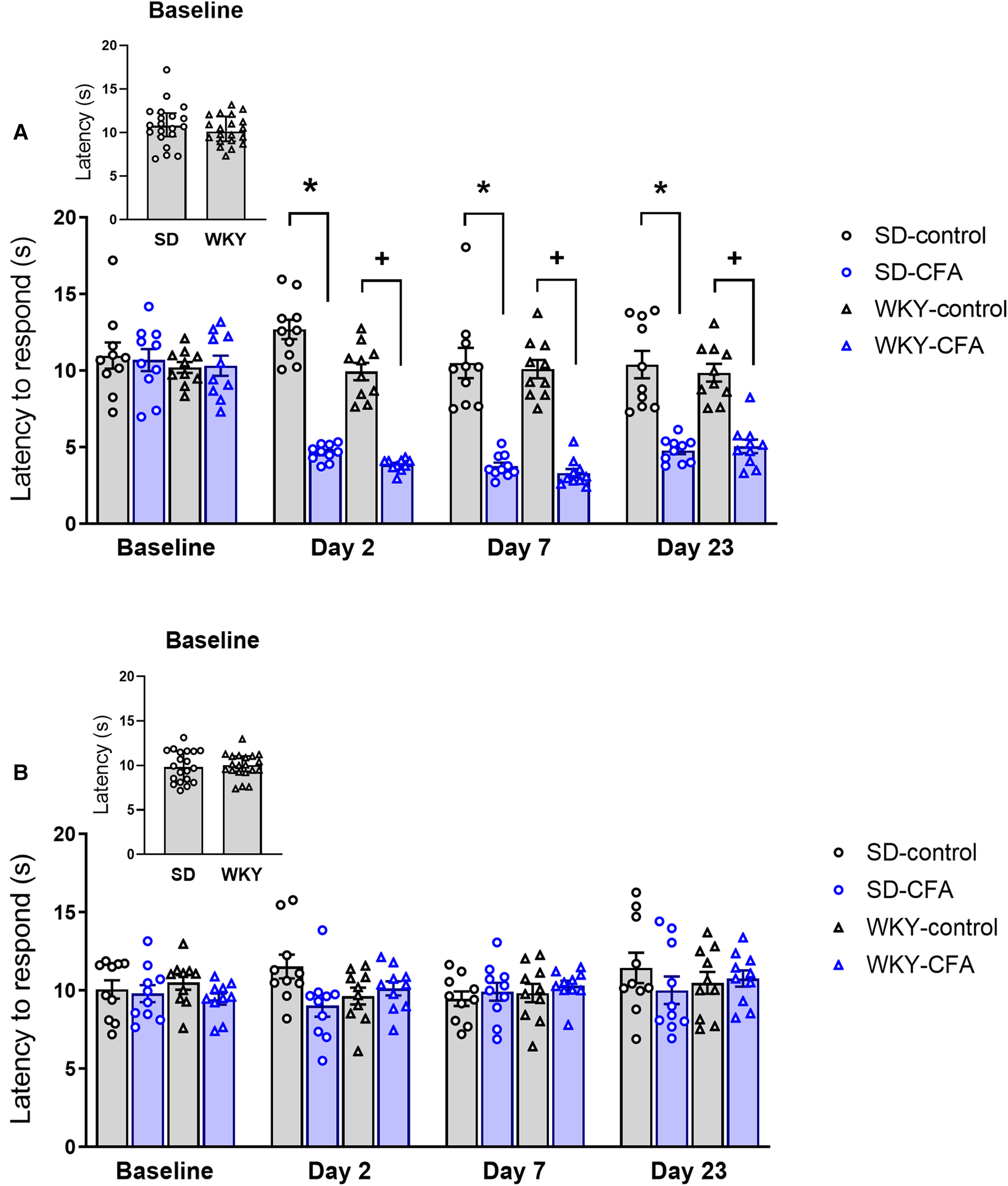 Time course of the effects of CFA injection on nociceptive responding to noxious heat stimuli on the (A) ipsilateral and (B) contralateral hind paws in SD and WKY rats. (A) Ipsilateral side: CFA injection produced similar heat hypersensitivity in SD and WKY rats (assessed in HG test) on Days 2, 7, and 23 post-injection [*p < 0.05 (SD-CFA vs. SD-control), +p < 0.05 (WKY-CFA vs. WKY-control)]. (B) Contralateral side: Response latency to noxious heat stimulus was similar between WKY and SD rats. Data are expressed as mean ± SEM, n = 10/group. CFA, complete Freund's adjuvant; HG, Hargreaves’; PWT, paw withdrawal threshold; SD, Sprague–Dawley; WKY, Wistar–Kyoto.