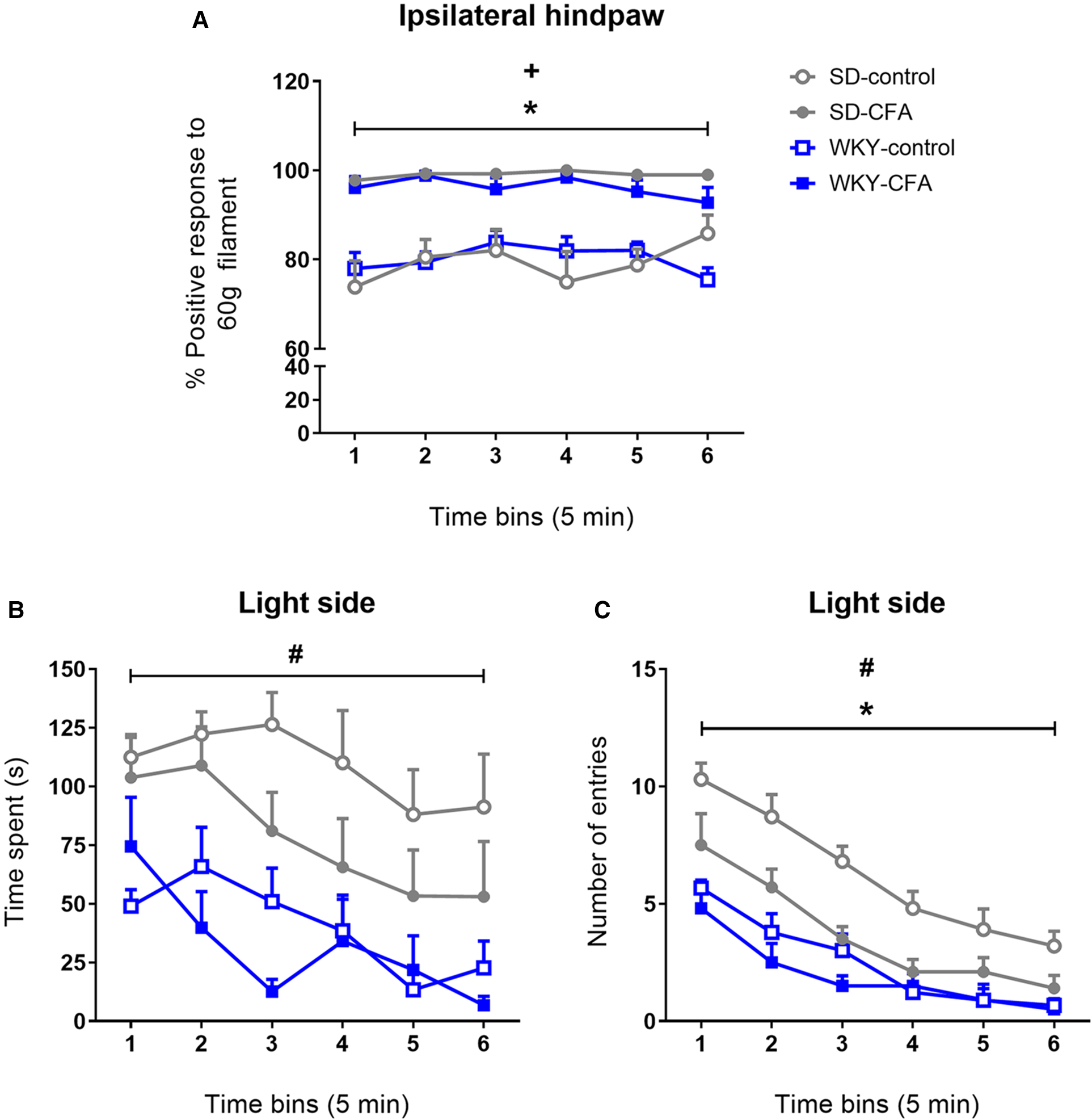 Effects of CFA injection in the PEAP in SD and WKY rats (Day 11 post-injection). The ipsilateral hind paw was stimulated when the animal was in the dark side and the contralateral hind paw was stimulated when it was in the light side of the arena. (A) CFA-injected SD and WKY rats showed higher percentage positive response when stimulated with 60 g von Frey filament on the ipsilateral hind paw, compared to control counterparts. (B and C) Temporal profile of time spent and number of entries into the light side in SD and WKY rats during the 30-min trial. Neither SD-CFA nor WKY-CFA rats displayed increased (B) time spent or (C) number of entries into the light side over the course of the trial, compared to respective control counterparts. Data are presented in 5 min bins and expressed as mean ± SEM, n = 9–10/group. *p < 0.05 (SD-CFA vs. SD-control), +p < 0.05 (WKY-CFA vs. WKY-control), #p < 0.05 (WKY-control vs. SD-control). CFA, complete Freund's adjuvant; PEAP, place escape/avoidance paradigm; SD, Sprague–Dawley; WKY, Wistar–Kyoto.