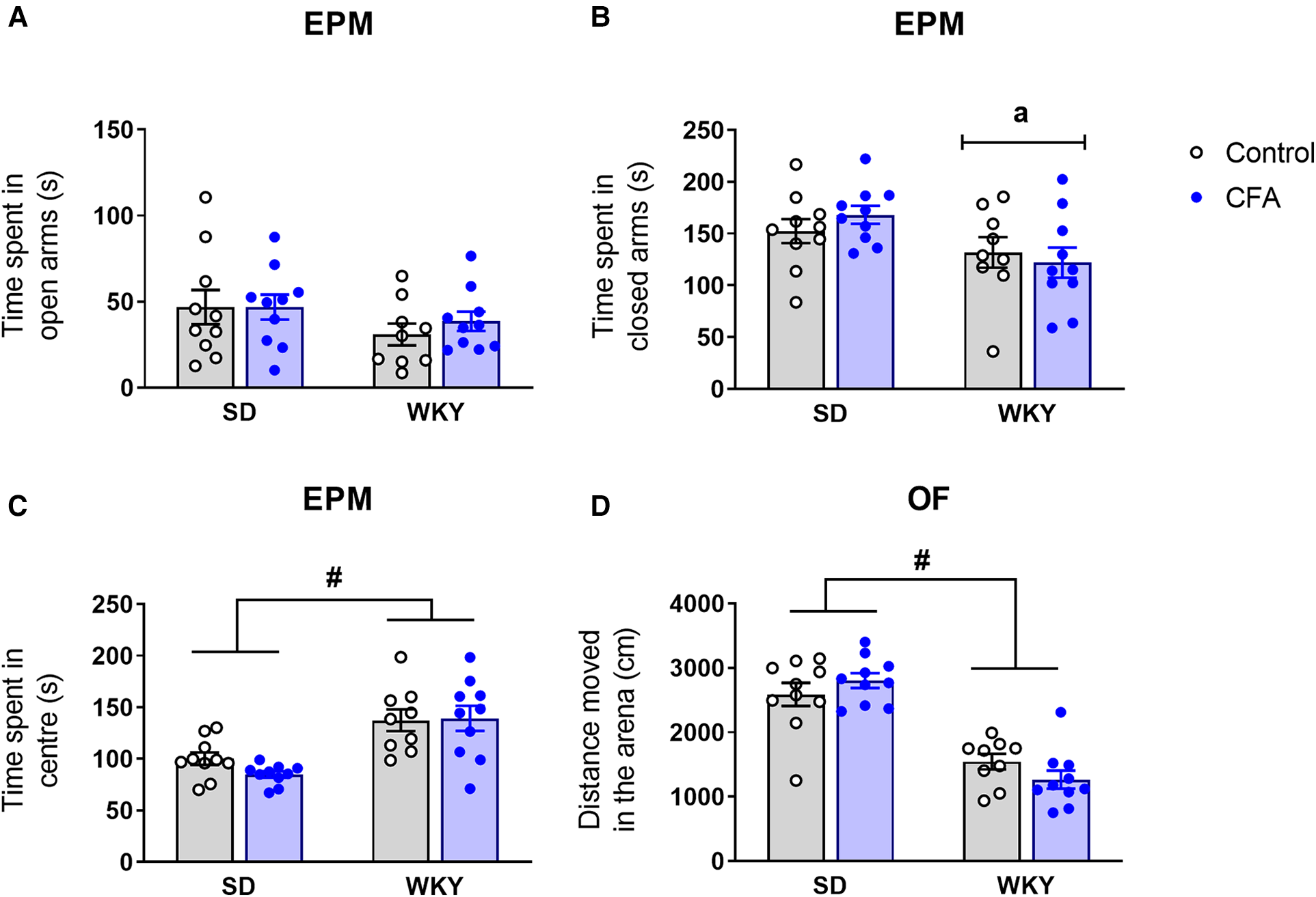 Effects of CFA injection on (A–C) anxiety-related behavior in the EPM and (D) general locomotor activity in the OF test in SD and WKY rats (Day 13 post-injection). (A) There was no significant strain difference in time spent in open arms. CFA injection did not affect time spent in open arms in either strain. Overall, WKY rats spent less time in the closed arms (B) but more time in the center (C) of the maze, compared to SD counterparts. (D) WKY rats displayed reduced distance moved in the OF, compared to SD rats. CFA injection did not affect distance moved in either strain. Data are expressed as mean ± SEM, n = 9–10/group. a = main effect of strain, p < 0.05; #p < 0.05 (WKY vs. SD counterpart). CFA, complete Freund's adjuvant; EPM, elevated plus maze; OF, open field; SD, Sprague–Dawley; WKY, Wistar–Kyoto.