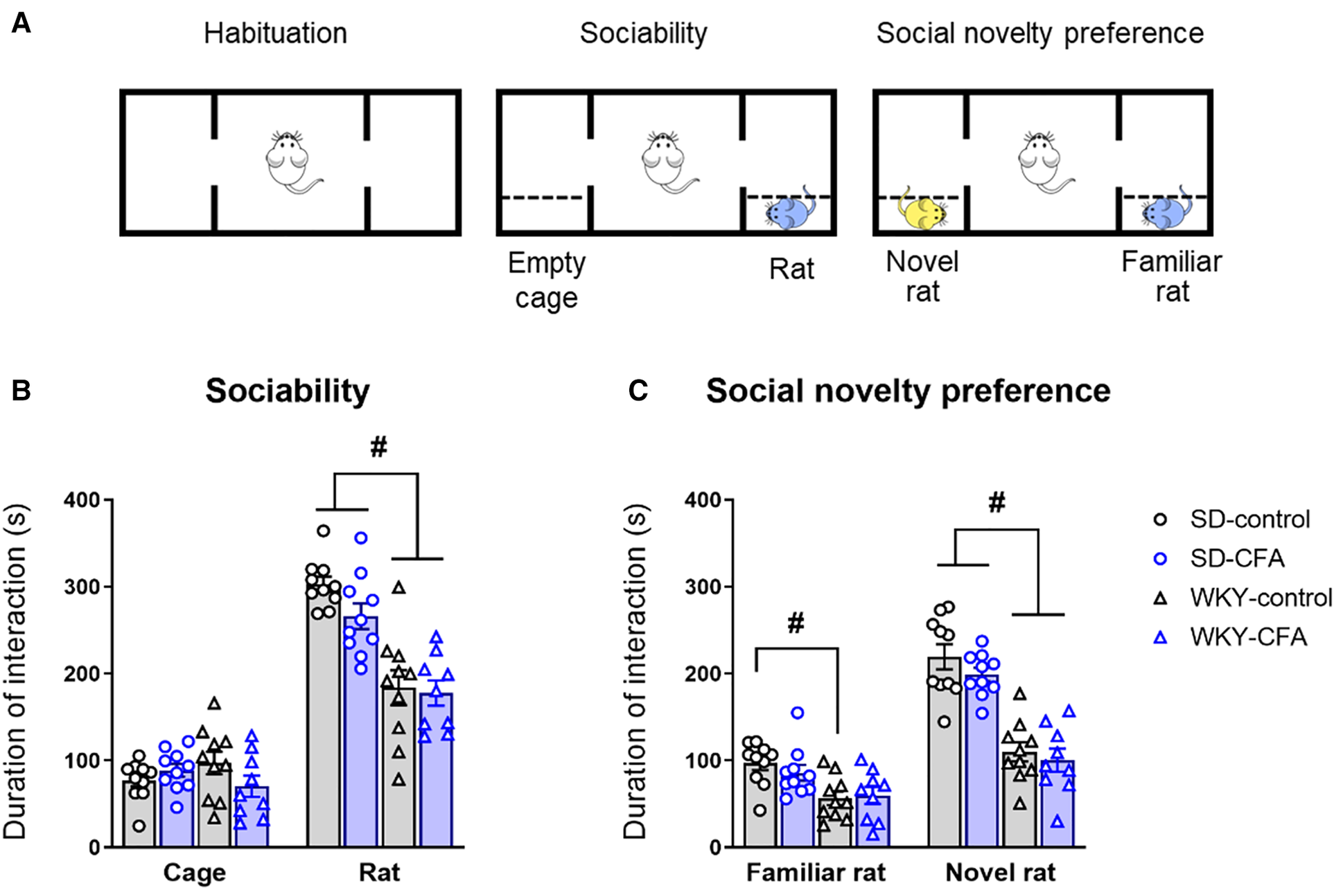 Effects of CFA injection on social behavior and social memory in SD and WKY rats in the 3-CST (Day 15 post-injection). (A) Schematic diagram of the time course of 3-CST. The test consists of three consecutive 10-min sessions where the test animal can freely explore the empty arena (habituation), an empty cage or a novel rat (sociability), and a second novel rat and the now familiar rat (social novelty preference). (B) In the sociability phase, WKY rats overall spent less time interacting with the conspecific rat (social stimulus), compared to SD rats. (C) In the social novelty preference phase, WKY rats overall spent less time interacting with the novel conspecific rat, compared to SD rats. CFA injection did not affect sociability or social novelty preference in either strain. Data are expressed as mean ± SEM, n = 9–10/group. #p < 0.05 (WKY vs. SD counterpart). CFA, complete Freund's adjuvant; 3-CST, three chamber sociability test; SD, Sprague–Dawley; WKY, Wistar–Kyoto.