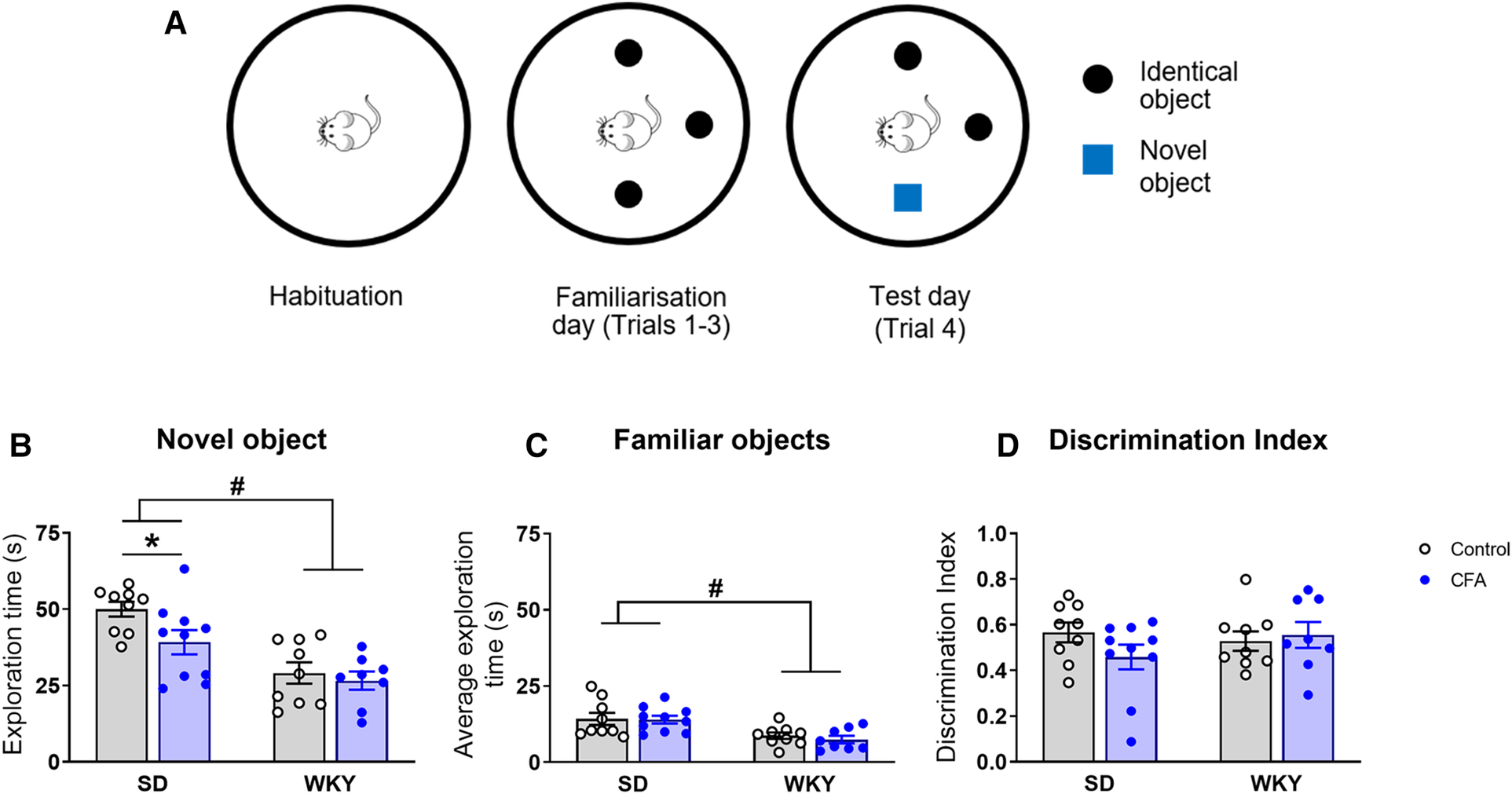 Effects of CFA injection on object recognition memory in SD and WKY rats in the NOR test (Day 18 post-injection). (A) Schematic diagram of the time course of NOR test. The test consists of 3 sessions on consecutive days: habituation (exploration of the empty arena), familiarisation (three trials, 5 min each, for exploration of three identical objects with 5 min inter-trial interval), and test (one trial of 5 min for exploration of familiar and novel objects). (B) Overall, WKY rats spent less time exploring the novel object in the arena, compared to SD rats. SD-CFA rats spent less time exploring the novel object than control counterpart. (C) WKY rats also spent less time exploring the familiar objects in the arena on the test day, compared to SD rats. (D) Discrimination index was similar between SD and WKY rats irrespective of CFA injection. Data are expressed as mean ± SEM, n = 8–10/group. *p < 0.05 (SD-CFA vs. SD-control), #p < 0.05 (WKY vs. SD counterpart). CFA, complete Freund's adjuvant; NOR, novel object recognition; SD, Sprague–Dawley; WKY, Wistar–Kyoto.