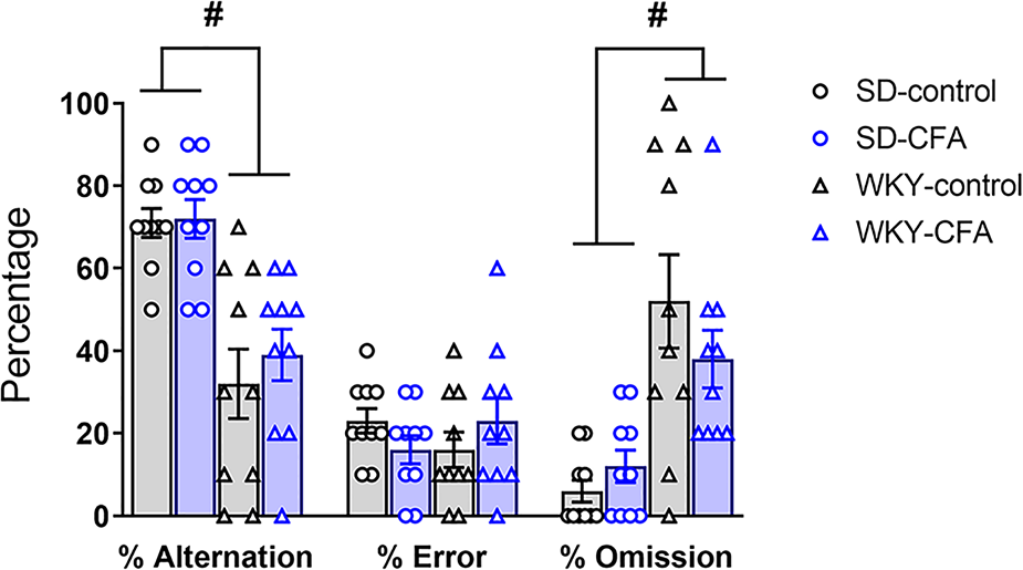 The CFA-injected WKY rats exhibited greater mechanical but similar heat hypersensitivity compared to SD counterparts. Neither strain displayed CFA-induced pain avoidance or anxiety-related behavior. No CFA-induced impairment was observed in social interaction or spatial memory in WKY or SD rats in the three-chamber sociability and T-maze tests, respectively, although strain differences were apparent. Reduced novel object exploration time was observed in CFA-injected SD, but not WKY, rats. However, CFA injection did not affect object recognition memory in either strain.