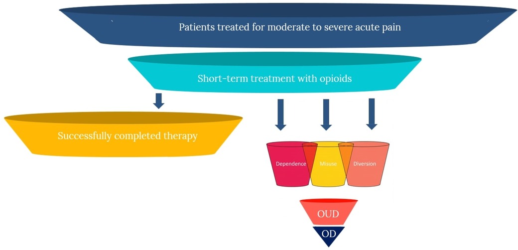 The cycle of acute pain, opioid dependence, addiction, misuse, and poorly managed pain leaves individuals at substantially higher risk for progression to substance use disorders. The term “opioid use disorder” (OUD), which is listed in the American Psychiatric Association DSM-5, generally refers to repeated or consistent misuse of opioids, and includes more clinically serious forms of abuse or addiction (62). According to estimates based on the 2021 NSDUH, among US adults with past-year prescription opioid use, 4.8 million (7.0%) had prescription opioid use disorder (46). Similar to estimates of rates of misuse, rates of OUD vary depending on population, methods, and timeframe, with some estimates of OUD as high as 12% (47). Prescription opioids can in some cases serve as a “gateway” to non-medical use and progression to OUD (63). For example, Butler et al. found that among ED patients reporting nonmedical opioid use or heroin use, 59% indicated initial exposure via prescription opioids (64). A large study of dental patients conducted by Schroeder et al. found that 5.8% of opioid-exposed individuals experienced one or more subsequent health care encounters associated with an opioid abuse-related diagnosis, compared with 0.4% in the control group (37). These effects have also been shown to be dose dependent. In a large study of adolescents and young adults with opioid prescription claims in a large commercial claims database, Chua et al. found that each increase in daily opioid dosage category was associated with higher overdose risk [adjusted odds ratio (AOR), 1.18; 95% CI, 1.05–1.31] (65). In some cases prescription opioids can also act as a gateway to abuse of other more potent forms of opioids, including heroin and synthetic fentanyl, as well as progression to other forms of SUD (66, 67).