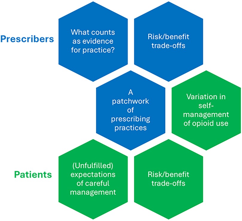 Results: For prescribers, three key themes were identified: (1) A patchwork of prescribing practices with diverse influences on health professional’s decisions, including the ‘norm’ of each site; (2) What counts as evidence for practice? in which prescribers relied on clinical experience, more than guidelines; And (3) Risk-benefit trade-offs that prescribers make when challenged to treat pain while minimising side effects. Analysis of patients’ data also identified three key themes: (1) (Unfulfilled) expectations of careful pain management such as evidence-based decisions and close monitoring to avoid harm; (2) Risk-benefit trade-offs: fear of pain vs. fear of side effects including anxiety about both expected pain and expected side effects, and (3) Variation in self-management of opioid use due to varying interpretation of vague instructions. The views and expectations of prescribers and patients differ and sometimes conflict with each other.