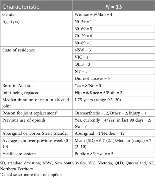 Twenty prescribers and thirteen patients were interviewed. Interview duration ranged between 15 min and 1 h. Six of these patients also took part in post-surgical follow up interviews. Most of the prescribers were recruited from personal contacts and the majority agreed to participate when approached. The patients were recruited from a variety of sources including social media and as a result it is difficult to be prescriptive as to the percentage of patients who agreed to participate as to the number of patients approached. Prescriber and patient characteristics can be found in Tables 1, 2. The study included 20 prescribers from diverse clinical backgrounds including clinicians from anaesthetics, orthopaedics, geriatrics and rehab with of varying levels of seniority. Most of the patients were women aged 60–79 years, had hip or knee osteoarthritis, and reported moderate to severe pain despite varied opioid use histories and healthcare settings.