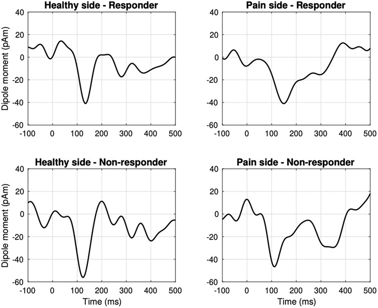 Figure 1. Grand-average source waveforms evoked by noxious laser stimulation in the responder group (n = 10) revealed a significant phasic N2 m peak in the contralateral primary somatosensory cortex (S1) at the control site [t-test against zero: 136 ms, t(9) = −4.5, p = 0.01] and the symptomatic dermatome [149 ms, t(9) = −4.5, p = 0.01]. In the non-responder group (n = 5), N2 m components were present with a latency of 125 ms at the control site [t(4) = −1.7, p = 0.07] and 115 ms at the affected side [t(4) = −2.5, p = 0.05]. Data were filtered using a 0.5–15.0 Hz band-pass filter.