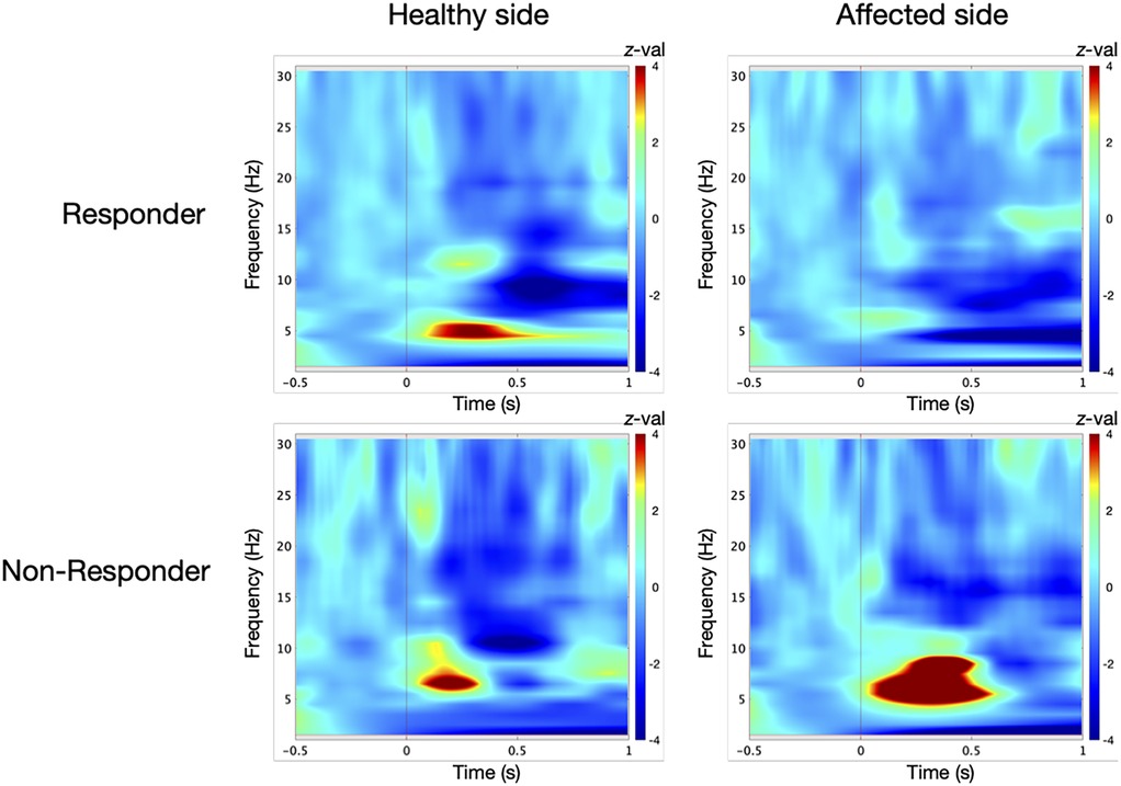 Figure 2. Induced low-frequency oscillatory responses in the contralateral primary somatosensory cortex (S1) were analyzed for ten responders and five non-responders at the control site and the affected trigeminal dermatome prior to microvascular decompression (MVD). Oscillatory power is displayed as z-scores relative to a 500 ms baseline. In responders, time-frequency analysis revealed a significant power increase at the control site [t-test against baseline: 5 Hz/242–325 ms; t(9) = 9, p = 0.01]. At the affected side, the oscillatory response was diminished compared to the control site [t-test against baseline: 6 Hz/8–188 ms and 5 Hz/25–28 ms; t(9) = 2, p = 0.05]. In contrast, non-responders exhibited a significant power increase at the affected dermatome [t-test against baseline: 7 Hz/280–352 ms; t(4) = 23, p = 0.01], which exceeded the response observed at the control site [t-test against baseline: 6 Hz/126–224 ms; t(4) = 9, p = 0.01].