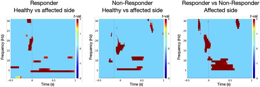 Notably, oscillatory patterns at the TN site significantly differed between responders and non-responders [permutation test: 5 Hz/316–438 ms, t(13) = 4, p = 0.05, d = 2.191; Figure 3].