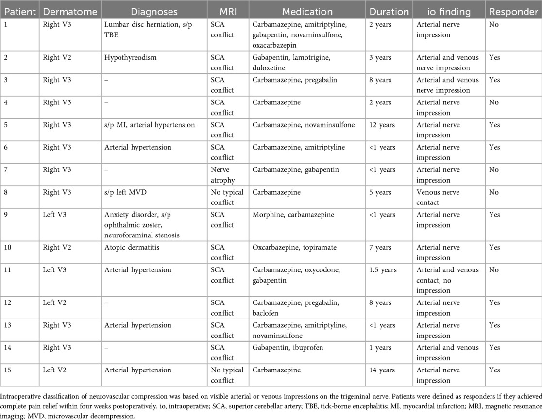 The responder group (n = 10) consisted of patients who reported complete absence of trigeminal pain attacks and remained entirely pain-free four weeks after MVD. The non-responder group (n = 5), in contrast, was defined by persistent pain symptoms despite continued use of medication.