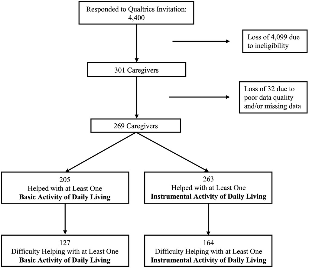 Flowchart depicting the selection process of caregivers. Initially, 4,400 responded to a Qualtrics invitation. 4,099 were excluded due to ineligibility, leaving 301 caregivers. After removing 32 for poor data quality or missing data, 269 caregivers remained. Of these, 205 helped with at least one basic activity of daily living, with 127 experiencing difficulty. Additionally, 263 helped with at least one instrumental activity of daily living, with 164 facing difficulty.