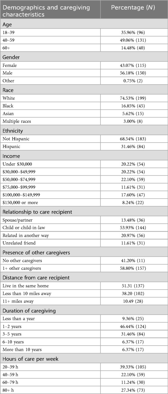 We collected data on the following caregiving demographics: age, gender, race, ethnicity, and income. We also collected data on caregiving characteristics, including whether there were additional caregivers in the care network, the caregiver's relationship to the care recipient, how far the caregiver lived from the care recipient, how long the caregiver had been providing care, and how many hours per week the caregiver provided care.