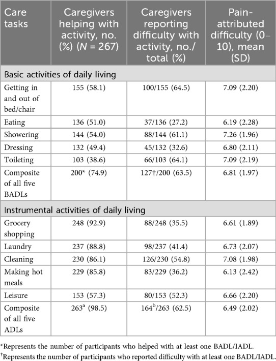 Outcomes: pain-attributed difficulty with care tasks