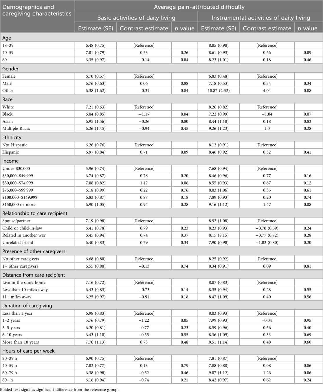 Associations between pain-attributed difficulty and caregiver demographics and caregiving characteristics