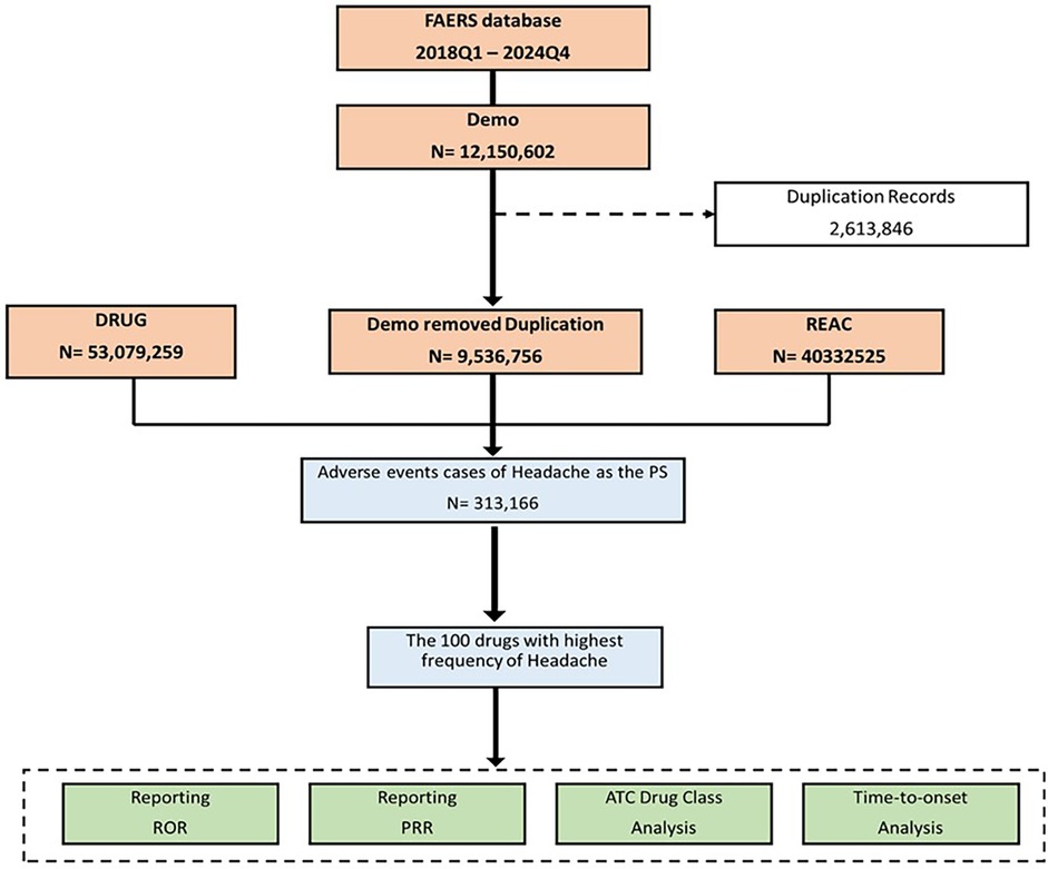 A total of 28 quarters of data, spanning from Q1 2018 to Q4 2024, was downloaded and stored in XML format. Each quarterly dataset included patient demographics (DEMO), indication (INDI), drug use records (DRUG), therapy duration (THER), adverse event records (REAC), and patient outcomes (OUTC). To process the downloaded data in R (version 4.3.3), the dataset was initially cleaned in accordance with FDA recommendations for eliminating duplicate reports. For reports sharing the same CASEID, the one with the latest FDA_DT value was preserved. In instances where both CASEID and FDA_DT were identical, the report with the highest PRIMARYID was retained. Subsequently, the dataset was further refined to include only reports where the target drug was designated as the Primary Suspect (PS), enhancing the reliability of the study. To reduce potential confounding, secondary suspect and interacting drugs were excluded from the background counts for ROR and PRR calculations (17). All drugs reported in association with headache were extracted. Both brand and generic names were standardized for consistency. The term “headache” was identified using the MedDRA preferred term. No subtypes (e.g., migraine, tension-type) were specifically analyzed in this study to maintain uniformity and minimize diagnostic bias in spontaneous reports. Further details of this process are illustrated in Figure 1.