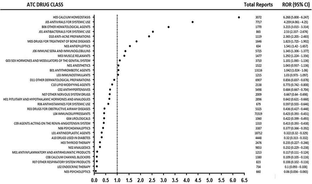 Figure 2. Signal strength (ROR) of the top drug classes associated with headache reports, stratified by ATC classification.