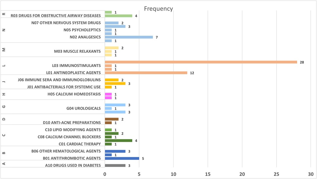 Figure 3 illustrates the distribution of drugs associated with headache as an ADR across different ATC categories. The largest number of drugs was found in the “L04 Immunosuppressants” category, with 28 drugs, followed by “B01 Antithrombotic Agents” with 5 drugs. Other categories, such as “J05 Antivirals for Systemic Use” and “N02 Analgesics,” also included several drugs linked to headache as an ADR. In contrast, categories like “B06 Other Hematological Agents” and “H03 Thyroid Therapy” contained only a single drug associated with this adverse effect.
