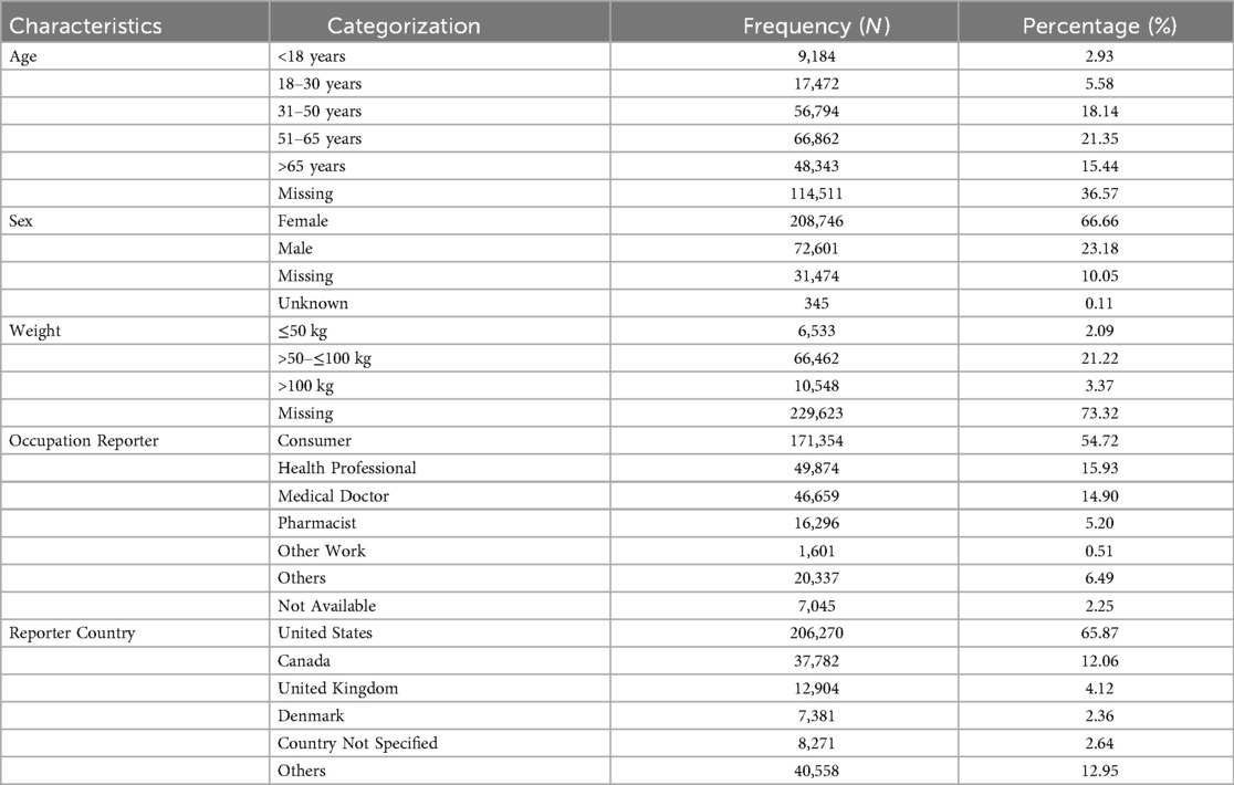 Our findings showed that females constituted the majority of reports (66.66%), consistent with evidence that women have a 1.5- to 1.7-fold higher risk of adverse drug reactions than men (21–23). The potential contributing factors include sex-based differences in pharmacokinetics (e.g., hepatic metabolism, cytochrome P450 activity), pharmacodynamics, hormonal influences, and immunological responses, as well as higher medication use among women (24, 25).