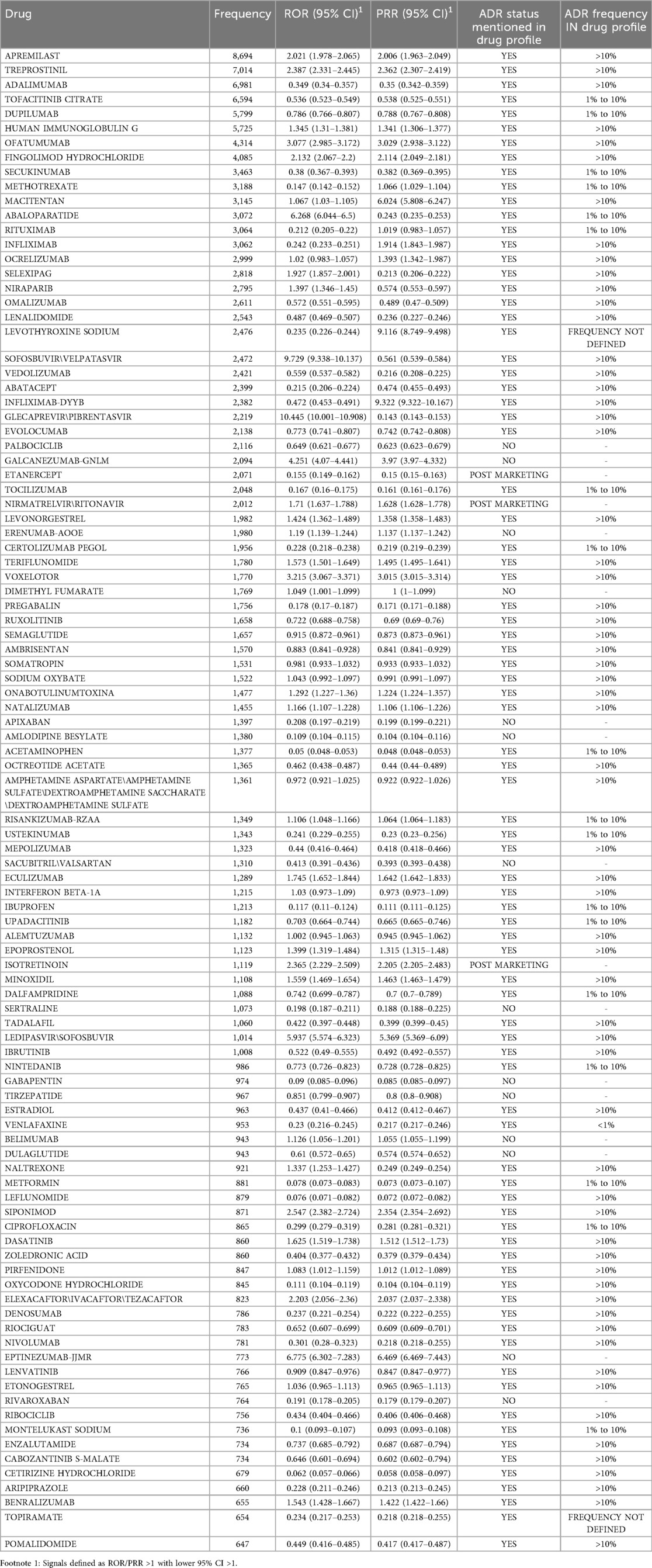 Table 2. Frequency, reporting odds ratios (RORs) and proportional reporting ratios of top 100 drugs associated with headache.