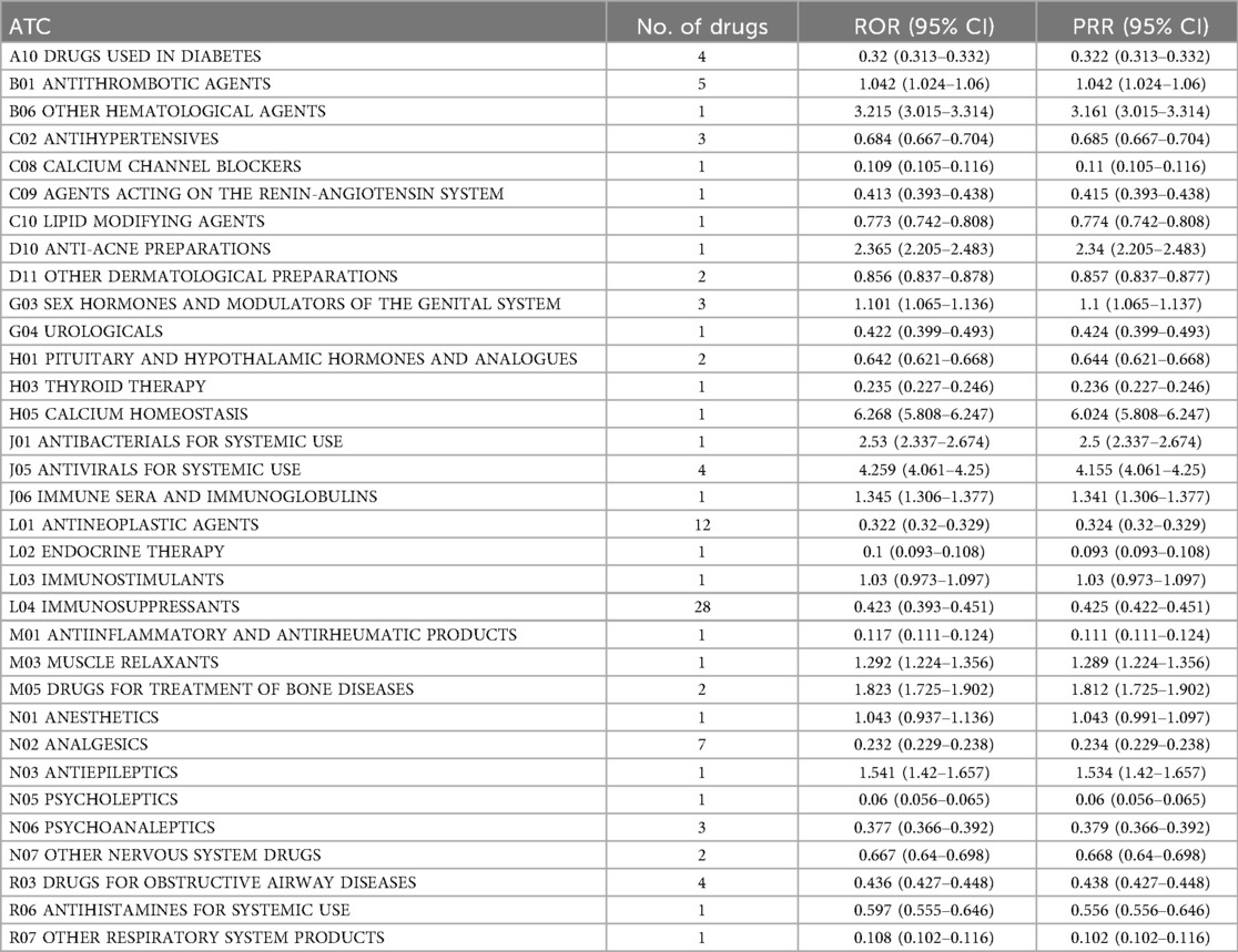 A drug was considered to have a positive signal if both ROR and PRR exceeded the threshold of 1.0 with the lower bound of the 95% CI also above 1 (20). These disproportionality measures provided a robust and standardized approach to detect elevated reporting frequencies of headache relative to other adverse events, supporting the identification of drugs and therapeutic categories with significant risk profiles. Onset time was calculated by subtracting the drug start date (start_dt) from the adverse event date (event_dt) in the FAERS database. Only reports with complete and valid date pairs were included.