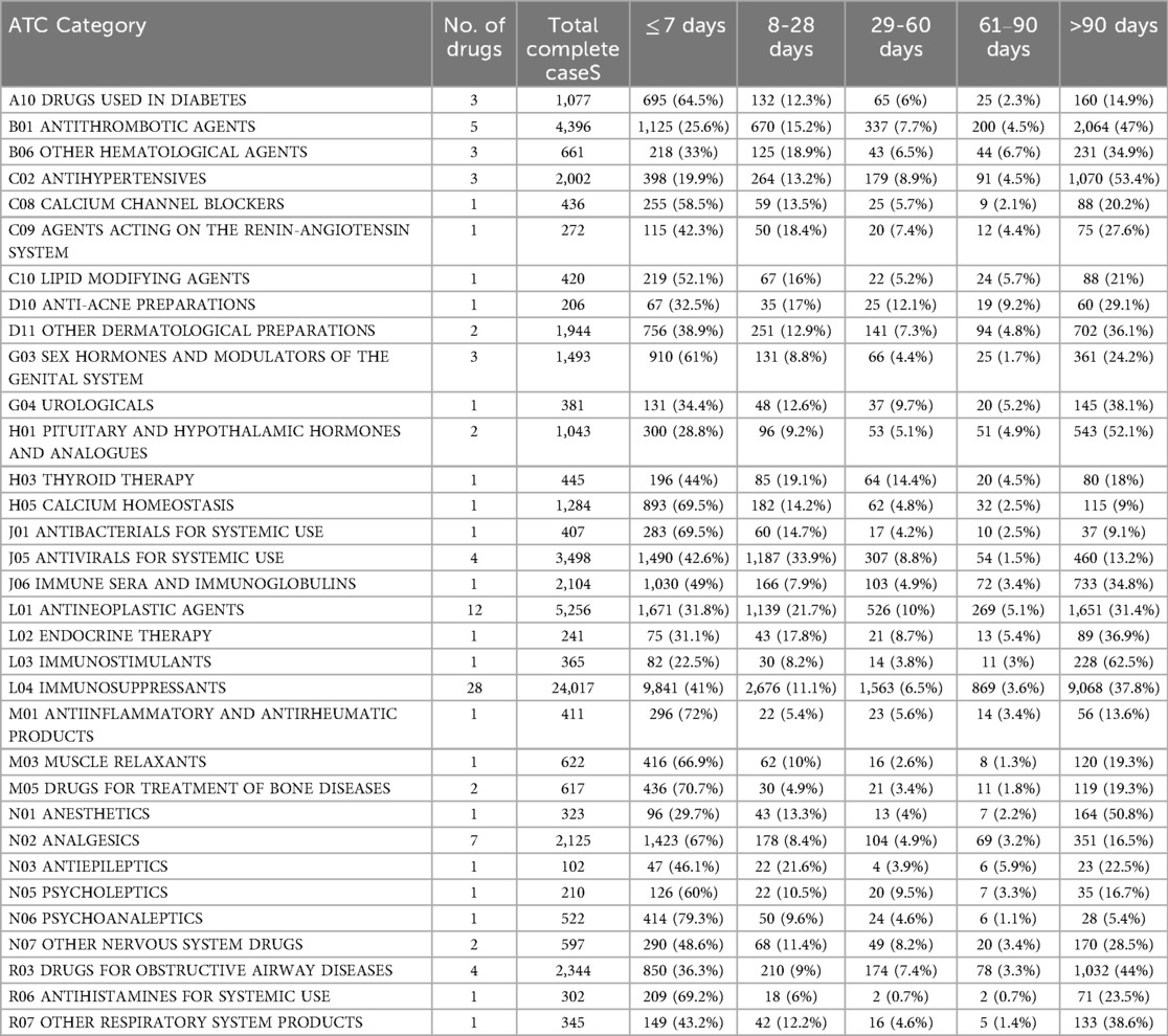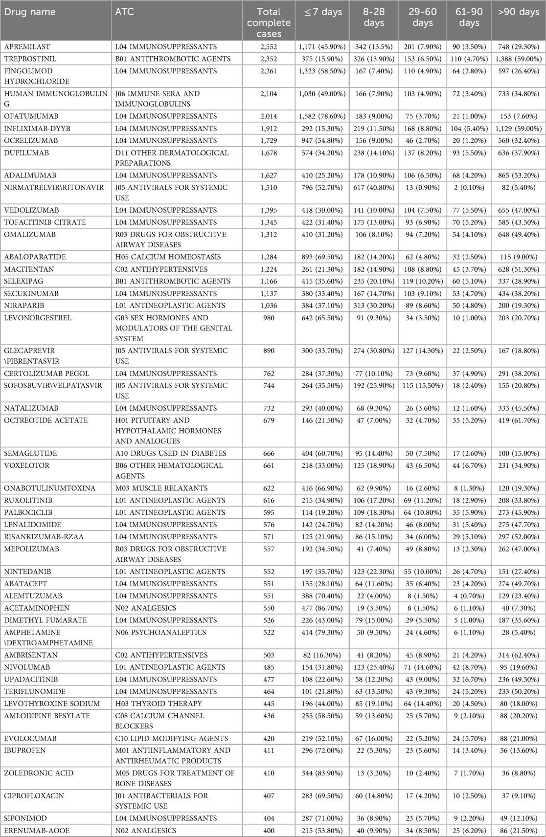 Table 5. Time-to-onset distribution of the Top 100 drugs associated with drug-induced headache by ATC category in total complete cases.