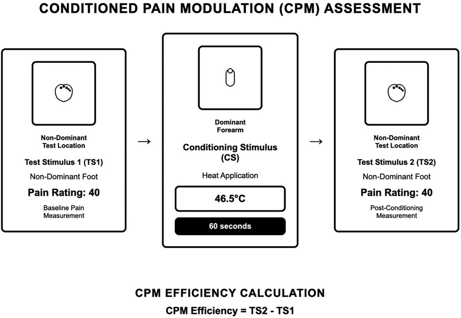 Clinical investigations have demonstrated that a subset of individuals with chronic pain exhibit significantly attenuated CPM efficiency compared to healthy controls (5, 12–14). Notably, therapeutic interventions demonstrate concurrent improvements in CPM efficiency and clinical outcomes in patients with osteoarthritis and diabetic neuropathy (15, 16). Clinical evidence demonstrates enhanced analgesic efficacy of duloxetine in patients with diabetic neuropathy and impaired CPM (17), while surgical interventions for osteoarthritis via total hip arthroplasty demonstrate restoration of CPM efficiency (16). Comparative analyses consistently reveal greater CPM efficiency in healthy populations vs. patients with chronic pain, with CPM enhancement correlating with clinical pain reduction (9, 18). These findings suggest interventions that improve endogenous inhibitory modulation of pain, as measured using CPM, should be considered in managing chronic pain.