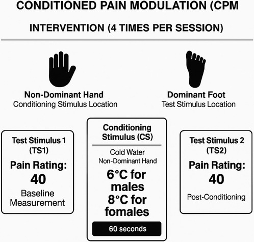 A methodological consideration of this investigation resided in the dual implementation of CPM as both an assessment instrument and therapeutic intervention, facilitating precise quantification of neurophysiological adaptations and temporal changes in CPM efficiency. However, our use of different conditioning stimuli for assessment (heat) vs. intervention (cold water) introduces variability, as CPM efficiency is known to be highly dependent on specific protocol parameters (1, 8)The recruitment of healthy, pain-free participants enabled the isolation of intervention effects on neural mechanisms without confounding pathological variables, enhancing methodological rigor and result reliability.