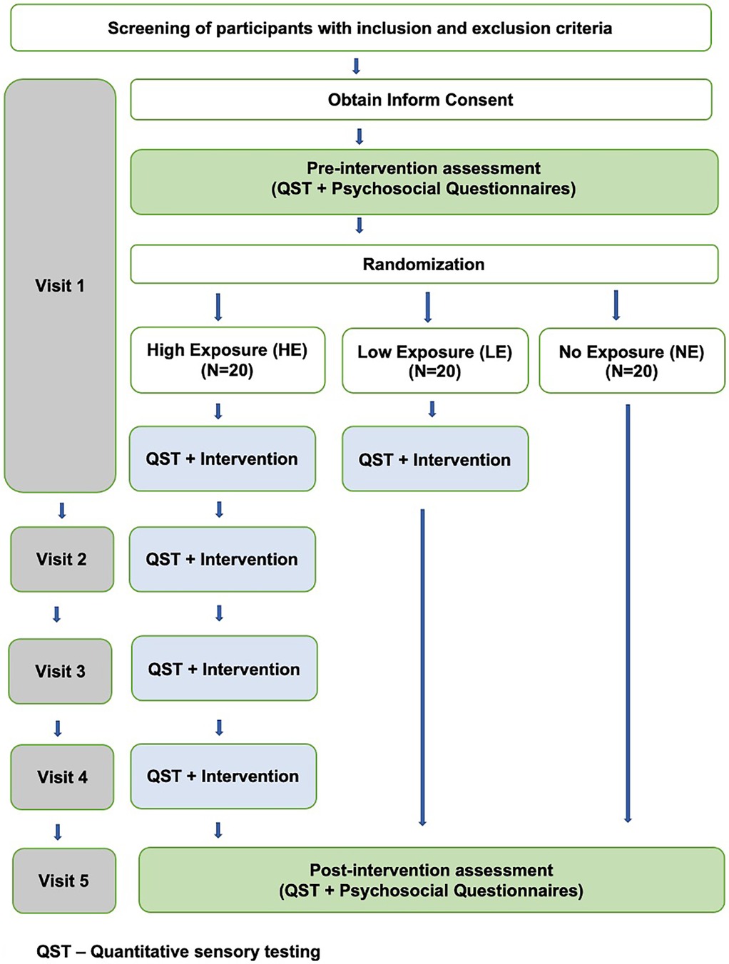The NE group served as a true “no exposure” group that did not have any experimental engagement of CPM. Our rationale for this design was that even baseline testing could constitute “exposure” to the “intervention” essentially resulting in two low exposure groups. Participants completed two sessions involving questionnaires and one QST session, with QST conducted exclusively during the final session after two weeks of the first session.