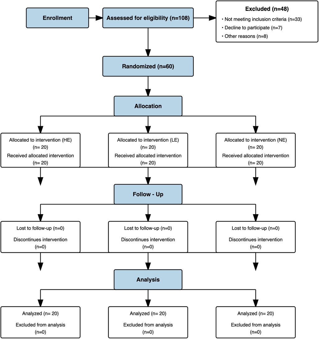 Participants were randomly assigned intervention groups using a computerized allocation sequence, which was securely stored in a password-protected digital repository to maintain allocation concealment throughout the study protocol. Participants were randomly assigned to three groups using computer-generated randomization: High Exposure (HE), Low Exposure (LE), and No Exposure (NE) as shown in Figure 3.