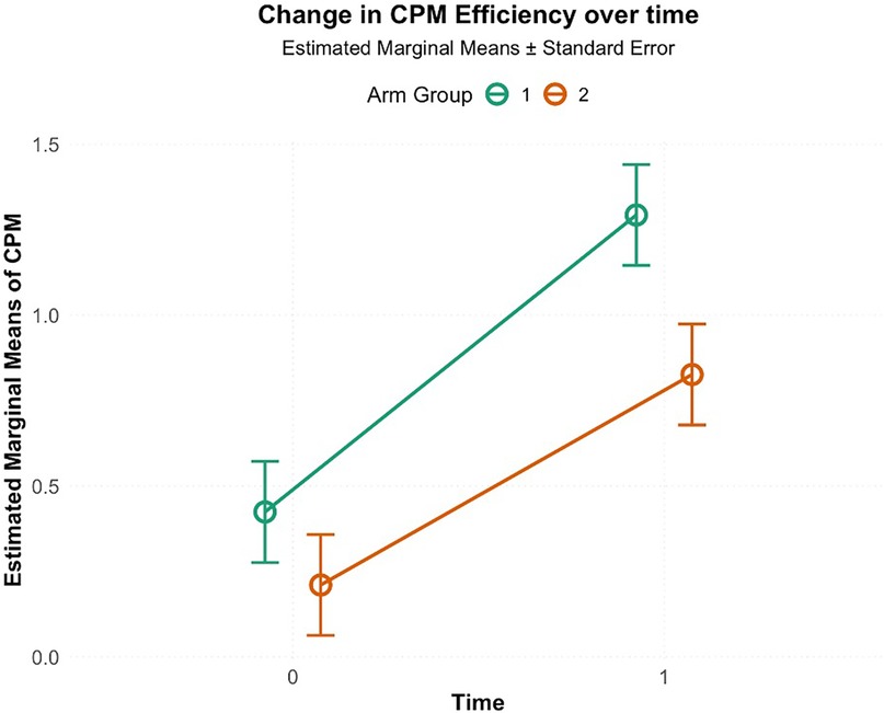 Figure 5. Change in CPM efficiency from pre-intervention (0) to post-intervention (1; 5th visit) in high-exposure (Arm 1) and low-exposure (Arm 2) groups. Circles indicate estimated marginal means, and error bars represent standard errors. Both groups showed increased CPM efficiency, with greater improvement in the high-exposure group.