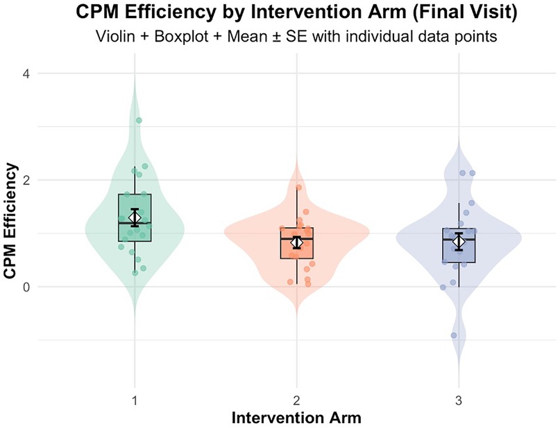 Figure 6. CPM efficiency at final visit by intervention arm: Arm 1 (high exposure), Arm 2 (low exposure), Arm 3 (no exposure/control). Violin plots depict data distribution; boxplots show medians and interquartile ranges; diamonds indicate means ± SE; individual data points are overlaid.