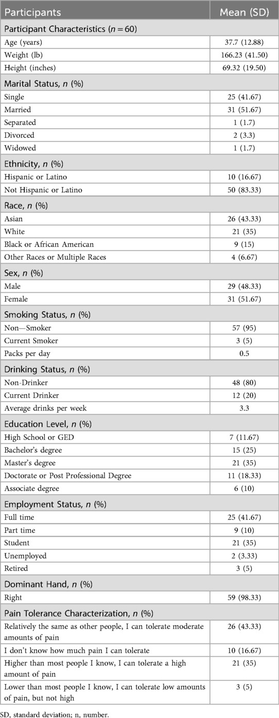 Sixty pain-free individuals were enrolled into the study, with an average age of 37 ± 12.88 years (range 18 to 75 years; See Figure 4). All 60 participants confirmed pain-free status at baseline (BPI-1 = 0), meeting inclusion criteria. The participants completed a standard intake form that included gender, age, employment status, marital status, educational level, and health history including a self-report item characterizing pain tolerance relative to others as shown in Table 1.
