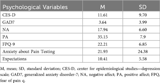 Pain perception is modulated by emotions through shared descending pathways originating from cerebral structures involved in affective and sensorimotor processing (30, 31). Since conditioned pain modulation (CPM) utilizes these same descending inhibitory pathways, psychological factors may influence CPM efficiency through reciprocal interactions. Supporting this hypothesis, Lazaridou et al. (32) demonstrated elevated back pain intensity in participants with concurrent high depression and low CPM efficiency, potentially mediated by depression-induced alterations in descending modulatory brain regions (32). However, other studies have found no significant association between anxiety and CPM efficiency (33, 34). Additionally, Ibancos-Losada et al. (33) reported no associations between CPM and depression, catastrophizing, pain history, or pain tolerance in healthy individuals (33). The predominantly cross-sectional nature of these studies, with single-timepoint CPM assessments, contributes to inconsistent findings regarding psychological factor-CPM relationships.