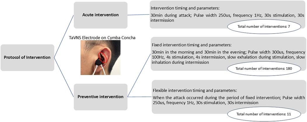 The patient was diagnosed with refractory chronic migraine. The preventive intervention project included the following two approaches: (1) TaVNS twice daily (morning/evening) for 30 min, with the following parameters: 300 µs pulse width, 100 Hz frequency (19, 20), and 4 s on/4 s off cycle. Additionally, the patient was instructed to exhale during stimulation and inhale during no stimulation. This synchronization enhances taVNS efficacy for pain intervention by more strongly activating the brain's pain inhibitory network (19, 20). (2) The second approach was flexible taVNS. The patients could use taVNS for an additional 30 min during headaches as an acute intervention, using the same parameters as those that were used in the acute intervention period (Figure 1). The 3-month treatment included monthly follow-ups, with the final assessment on 20 December 2024.