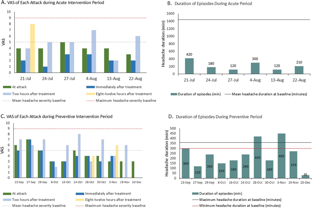 Figure 2. (A) Changes in VAS score during the acute intervention period. The VAS value for each bar represents the pain intensity at the corresponding time point. (B) Changes in the duration of headache episodes during the acute intervention period. (C) Changes in VAS score during the preventive intervention period. The VAS value for each bar represents the pain intensity at the corresponding time point. (D) Changes in the duration of headache episodes during the preventive intervention period.