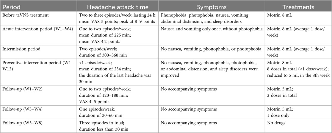 At the follow-up on 22 August 2024, the headache diary data showed significant acute headache improvement (details in section 3.1). The family requested a 1-month stimulator discontinuation to assess symptom self-management. Upon follow-up on 21 September 2024, the patient reported a headache frequency of two episodes/week (duration 300–360 min; medication use once/week). The patient and family then reapplied for taVNS therapy and joined the taVNS Preventive Intervention project (18).