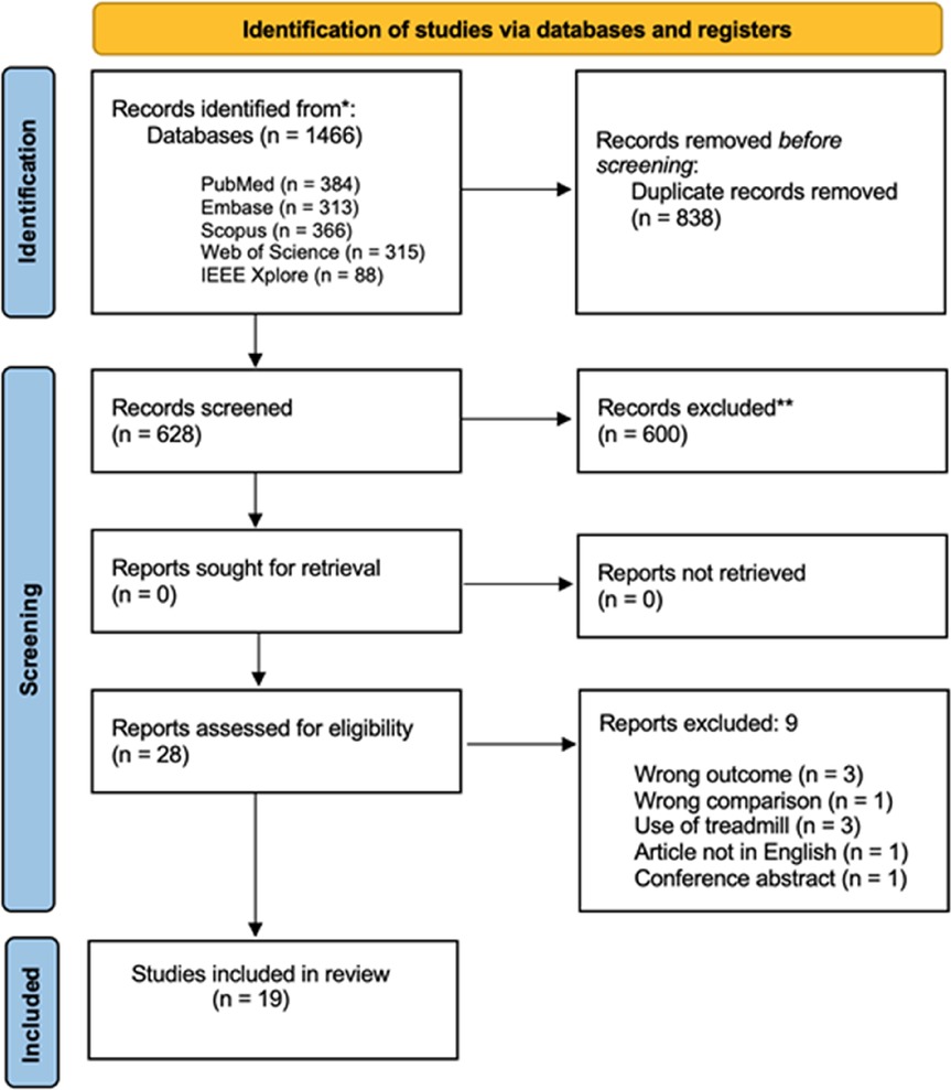 All the records obtained from the search process were managed using “Rayyan, Intelligent Systematic Review” (https://www.rayyan.ai) (17). Title, abstract, and full texts were screened independently by two blinded reviewers (FDF, MF) to identify eligible studies. Any discrepancy was resolved through a consensus with another reviewer (VC). At the time the first screening procedure was conducted (2023), this software had not yet implemented any artificial intelligence-based based features. Details of the study selection stage are reported in the PRISMA 2020 flow diagram (Figure 1). Main characteristics and the major findings of the included studies were extracted in a standardized form and summarized in a table (Table 1) reporting first author name and year of publication, study design, main objective, outcomes, sample size, the technology employed in the gait assessment and the main results obtained according to the aim of this review. The data extraction form was developed and approved by all the authors involved in this study, and a 6-h consensus training was implemented before starting. Once again, the same reviewers independently screened the included studies and resolved any disagreement through a discussion.
