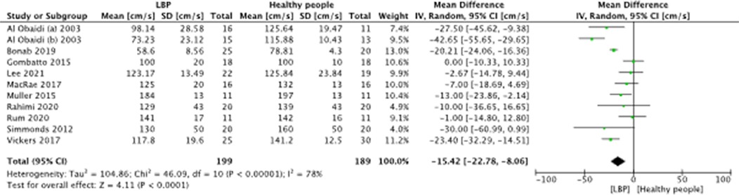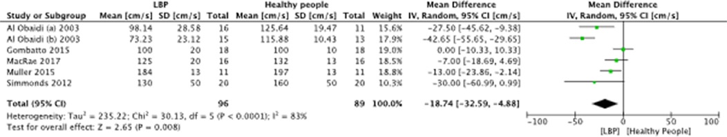 Figure 3. Forest plot of comparison between LBP subjects and healthy people (sensitivity analysis). Gait speed (cm/s.).