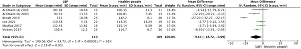 Results: Overall, a total of 19 cross-sectional studies were included in this review and none of those was found without methodological issues. The meta-analysis showed a lower gait velocity [−15.42 (−22.78, −8.06) cm/s; p ≤ 0.0001], a lower cadence [−9.85 (−18.72, −0.99) steps/min; p = 0.03] and a lower step length [−6.30 (−11.83; −0.77) cm; p = 0.03] in NS-LBP. Regarding motion analysis, a few authors observed a less and asymmetrical motion of the lower spine in the frontal and in the transverse plane.
