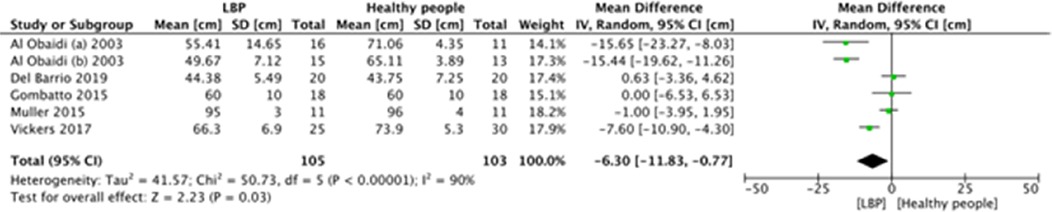 Other parameters such as gait cycle time, single and double support time (stance and swing duration) and step width were measured occasionally and in different modalities (in seconds or in percentage of gait cycle), thus a quantitative summary was not possible. To summarize, in two studies (11%) a significant reduction in the single support duration was found in LBP people, only one of these (22) registered a decrease in step time and in gait cycle duration. In the same way, Cimolin et al. (31) detected a longer stance duration and a shorter step length in a population of obese LBP.