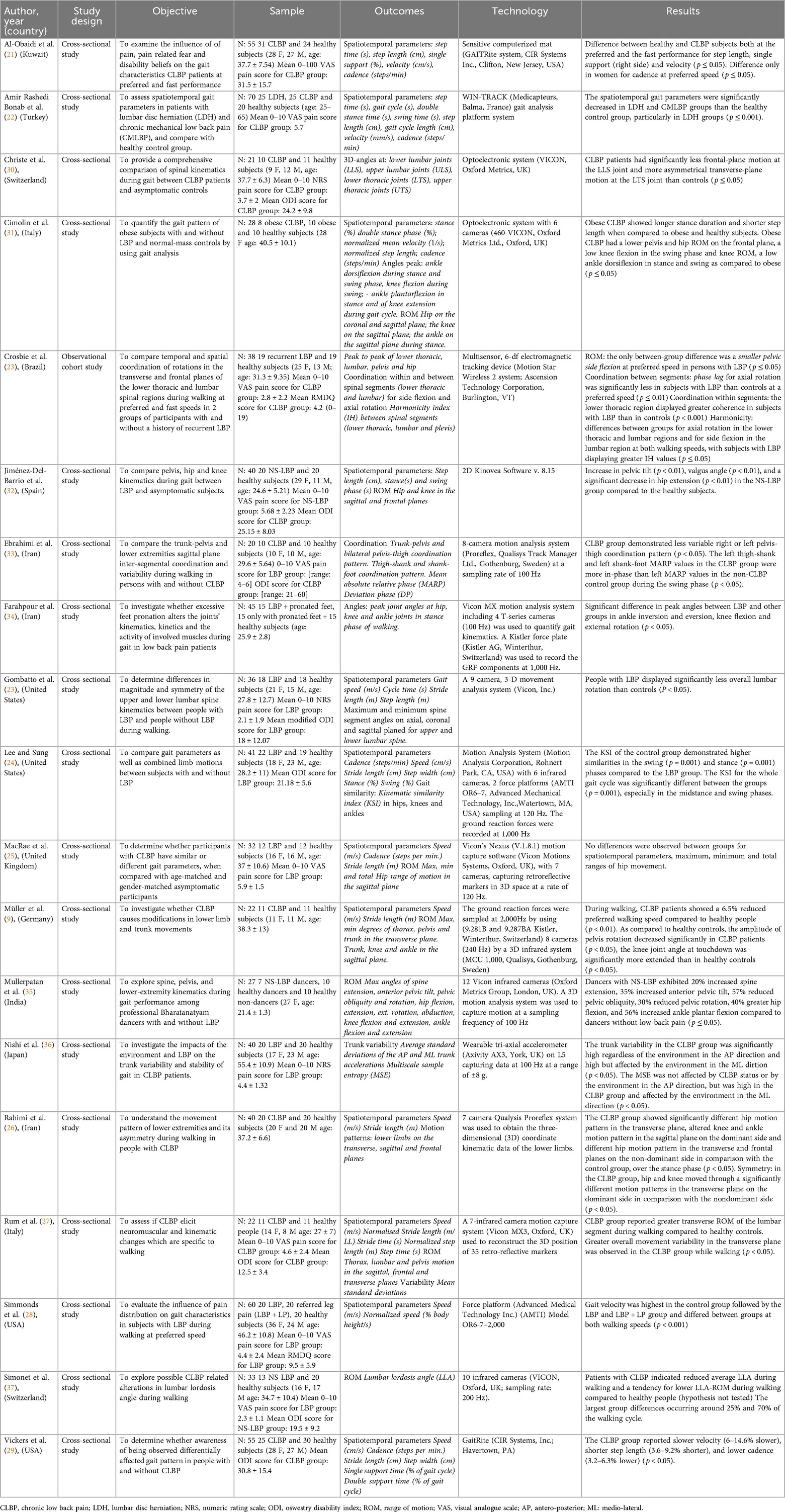 This systematic review with meta-analysis is, to our knowledge, the first to investigate gait kinematics in subjects with NS-LBP. In order to present the findings more clearly, we grouped them into two main categories: spatial-temporal parameters and quantitative kinematics.