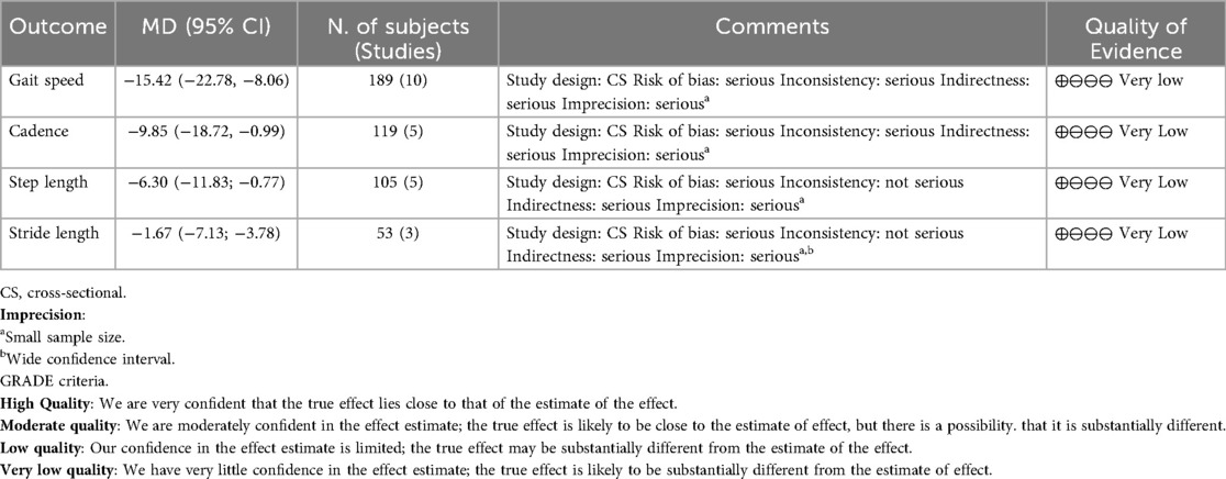 Concerning the quality of evidence, only the meta-analyzed outcomes (gait speed, cadence, step length, and stride length) were assessed. All were rated as “very low” because of the observational design, inconsistency, indirectness, and imprecision. Specifically, heterogeneity was evident in gait speed, cadence, and step length, likely due to sample differences in age, BMI, pain intensity, and disability levels, as only a minority of studies matched participants for confounders. Consequently, downgrading for inconsistency and indirectness was required. Finally, sample sizes were generally small (below 400), and for stride length the confidence interval crossed the line of no effect, justifying further downgrading for imprecision.