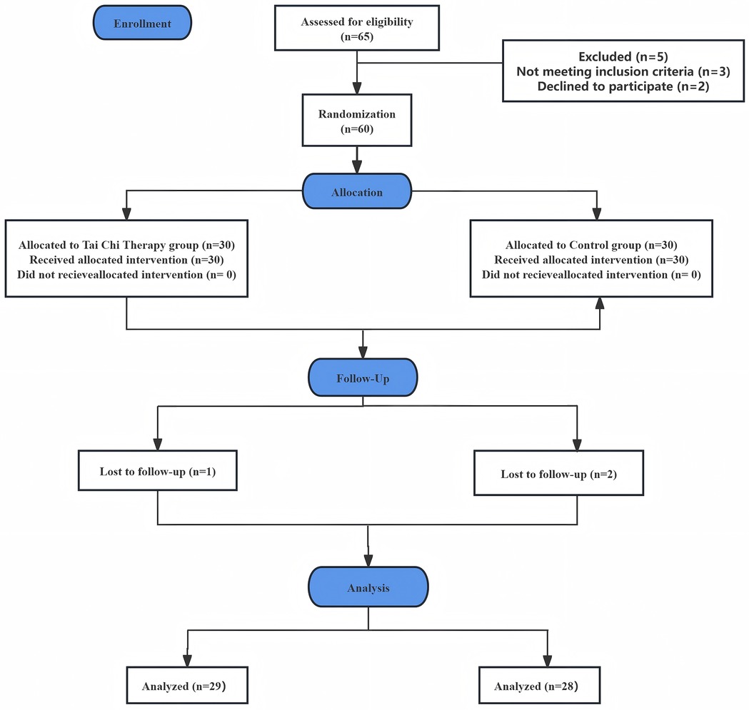 This study employed a randomized controlled trial design. An independent researcher generated a random allocation sequence using a random number table, assigning participants in a 1:1 ratio: lower values were allocated to the experimental group (EG), and higher values to the control group (CG). The EG received Tai Chi combined with intermediate frequency therapy, while the CG received intermediate frequency therapy alone. All interventions were administered by the same therapist to ensure consistency and standardization.