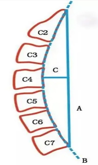 Cervical physiological curvature was assessed using x-ray imaging and the Borden method (17) (see Figure 2). This method involves drawing a straight line (A) from the posterior upper edge of the odontoid process of C2 to the posterior lower edge of the C7 vertebra. An arc (B) is traced along the posterior edges of each cervical vertebra. The maximum perpendicular distance (C) between lines A and B is measured as the cervical physiological curvature, denoted as the D value. A normal D value ranges from 7 to 17 mm; a D value < 7 mm indicates reduced cervical curvature, D = 0 mm denotes a straight cervical spine, and D < 0 mm indicates a reversed curvature.