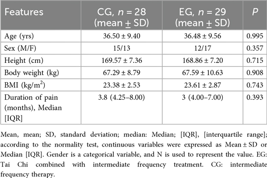 The physiological curvature of the cervical spine is a naturally formed, forward convex structure critical for maintaining the overall mechanical balance of the spine. In the present study, after 8 weeks of intervention, the D value of cervical curvature in the EG increased significantly compared to baseline (p < 0.05), and was also significantly higher than that of the CG at the end of treatment (p = 0.041). These findings indicate that Tai Chi combined with intermediate frequency therapy is more effective than intermediate frequency therapy alone in improving cervical physiological curvature in patients with CNSNP. This result is consistent with several randomized controlled trials that have shown beneficial effects of Tai Chi on cervical curvature in individuals with cervical spondylosis (14, 30).