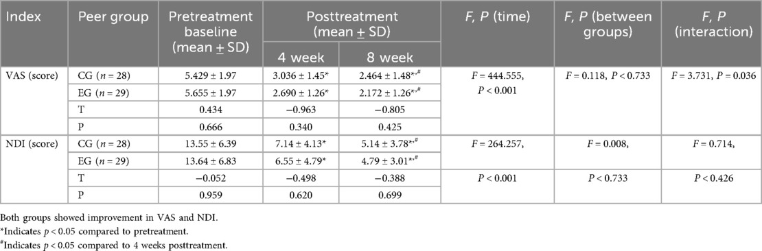 Prior to the commencement of the study, baseline demographic and clinical data—including age, gender, height, weight, and duration of CNSNP—were collected from all participants who met the inclusion criteria. All subjects completed pre-intervention assessments, including the VAS, NDI, D value of cervical curvature, and cervical ROM score.