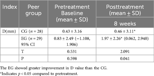 After 8 weeks of intervention, both groups exhibited significant increases in the cervical physiological curvature D value compared to baseline (p < 0.05). Notably, the increase in D value was significantly greater in the EG than in the CG (p < 0.05). Specifically, patients in the EG showed a marked improvement in D value following 8 weeks of Tai Chi combined with intermediate frequency therapy. These findings suggest that the combined intervention was more effective in enhancing cervical physiological curvature than intermediate frequency therapy alone (see Table 3).