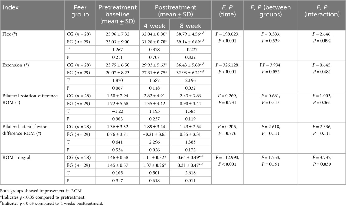 The levels of cervical flexion ROM, extension ROM, bilateral rotation difference ROM, and bilateral lateral flexion difference ROM in both groups met the assumptions of normality and homogeneity of variance (p > 0.05). However, Mauchly's test of sphericity was not satisfied for any of these variables—flexion ROM (Mauchly's W = 0.657, p < 0.001), extension ROM (Mauchly's W = 0.636, p < 0.001), bilateral rotation difference ROM (Mauchly's W = 0.837, p = 0.008), and bilateral lateral flexion difference ROM (Mauchly's W = 0.809, p = 0.003) —therefore, the Greenhouse-Geisser correction was applied to all analyses.